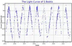 - 1 2 3 4 VSX (4 January 2010). "S Boötis". AAVSO Website. American Association of Variable Star Observers. Retrieved 17 July 2023.