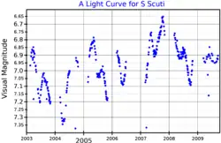 S Scuti is a semiregular variable star. Its class is SRb, and its pulsation cycle lasts 148 days.[4] It has a radius of 386 R☉.[4] S Scuti is also surrounded by a roughly spherical shell of dust. The shell was known earlier from its carbon monoxide emission lines.[6] The total mass of the dust is (7 ± 2)×10−5 M☉.[6]