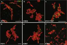 TM7 specific FISH probes identified species from a bioreactor sludge revealed the presence of a gram-positive cell envelopes and several morphotypes: a sheathed filament (abundant), a rod occurring in short chains, a thick filament and cocci; the former may be the cause of Eikelboom type 0041 (bulking problems of activated sludges).[10] The majority of bacterial phyla are Gram-negative diderms, whereas only the Bacillota, the Actinomycetota and Chloroflexota are monoderms.[19]