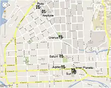From Uranus, visitors follow Willow Avenue northwest and cross the Carl Sagan bridge at Adams street to reach the Neptune Obelisk. The Carl Sagan Bridge, built in 2000, features nine circular windows adorned with the signs of the nine planets.[7] The obelisk for Neptune is located just across the bridge in Conley Park.