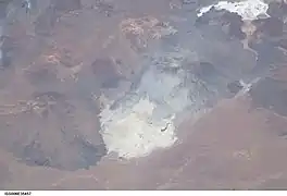 The principal salt has variously been stated to be either halite[9] or gypsum in the form of selenite.[10] There are minor amounts of calcium chloride, elemental sulfur[11] and ulexite.[12] The salts form a thick, brine-filled salt formation[13] with domes, mounds,[14] ridges, polygonal cracks,[2] tumuli[10] (an area covered with numerous domes is called "Dome Field"[9]) and a rough crust.[15] A raised area at the eastern end of the salar features small holes draped in gypsum[16] that appear to be produced by degassing.[17] Water at Salar de Pajonales is extremely salty,[18] with calcium chloride and calcium sulfate being the main components.[2] There is evidence of ongoing dissolution of the salt,[7] which has left deep pits[19] and cavities reaching 1–2 metres (3 ft 3 in – 6 ft 7 in) height.[20] The dissolution may be caused by salt draining into groundwater.[21] Salt deposition is influenced by the activity of cyanobacteria and sulfur-oxidizing bacteria,[22] which precipitate gypsum that may entomb microorganisms.[12]