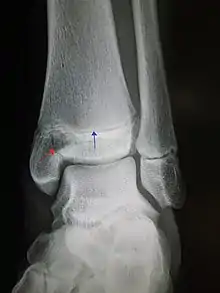 An X-ray of the left ankle showing a Salter–Harris type III fracture of medial malleolus. Red arrow demonstrates fracture line while the blue arrow marks the growth plate.