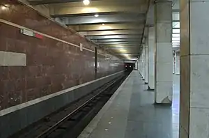 Samgori (Georgian: სამგორი) is a station of the Tbilisi Metro on the Akhmeteli–Varketili Line (First Line). It serves the district and the neighbourhood it is named after. Next to the station is the Tbilisi junction station of the same name of Samgori (sometimes called Navtlughi). Samgori metro station has two main entrances, the one from Moscow ave and the one from Kakheti highway connected with a tunnel that until the 90s had a travelator. The station walls are decorated with relief images.[1] The station was opened on 5 May 1971 as an extension of the 300 AragveliDidube line.