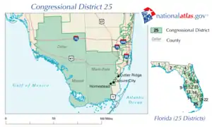 According to the state of Florida, 42% of the voters in this district are registered Republicans, and 36% are registered Democrats.[14] George W. Bush won this district with 52% of the vote in the 2000 presidential election, and with 54% of the vote in the 2004 presidential election.