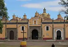 The San Gabriel church and friary was established in 1529 by the Order of Friar Minors, OFM, Franciscans, on top of the destroyed temple to Quetzalcoatl with evangelization as its initial purpose.[2][3][4] The current complex was built in the 1540s, beginning with the Capilla Real in 1540.[5] The main church was begun in 1549, with the first stone laid by Martín de Hojacastro, who would become the third bishop of Puebla.[6] There is also a third chapel by the name of the Capilla de la Tercera Orden and a cloister.[4] The friary is dedicated to the Archangel Gabriel and is one of the largest Franciscan friaries in Mexico.[3][6]