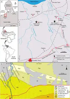 The San Gregorio Formation overlies the Codore Formation and forms the most recent sequence of the stratigraphic section. Outcrops of this formation are found in Falcón State, northeast of the town of Urumaco. The formation is named for the town of San Gregorio, Venezuela.[1]