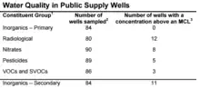 Nitrates have found their way into the aquifers around the San Joaquin Valley, affecting over 250,000 people in communities that are poor and rural.[49] In 2006, the State Water Resources Board took samples from domestic wells in Tulare County; they found that 40% of 181 domestic wells had nitrate levels above the 10 mg/L legal limit.[51] Though locals have typically used filters for their water, the filters need to be installed correctly and replaced frequently, which may not be economically feasible for the residents in Orosi.[52] Table 2 on page 20 from Pacific Institute's "The Human Costs of Nitrate-contaminated Drinking Water in the San Joaquin Valley" indicates the water systems that were contaminated with nitrates over the legal limit, the percentage of the population affected that are non-white and that are below or near poverty-level, and the year since the violations began.[51]