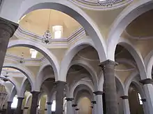The parish church of the San Pedro municipality faces that main square of the city and was built in the 17th century.[10][18] The architecture is a mix of Baroque and Renaissance, which is uncommon in Mexico for the 17th century. The bell tower is Baroque and one of the tallest in the city. It has a Latin cross layout and a vaulted ceiling. The interior has been restored and contain a Churrigueresque cupola, along with 18th-century paintings such as depictions of Christ by Diego de Borgraf.[8][17]