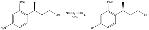 One of the most important uses of the Sandmeyer reaction is the formation of aryl halides. The solvent of choice for the synthesis of iodoarenes is diiodomethane,[17][18] while for the synthesis of bromoarenes, bromoform is used. For the synthesis of chloroarenes, chloroform is the solvent of choice.[19] The synthesis of (+)-curcuphenol, a bioactive compound that displays antifungal and anticancer activity, employs the Sandmeyer reaction to substitute an amine group by a bromo group.[20]