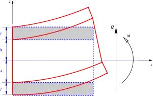 The stress resultants and the corresponding deformations of the beam and of the cross section can be seen in Figure 1. The following relationships can be derived using the theory of linear elasticity:[3][4]
