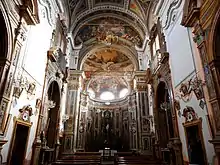 A Pietà painted by Pietro Novelli, was once present here, but now is on display in the Museo Diocesano of Palermo. The allegorical frescoes in the apse are attributed to Paolo Martorana, depict Christ granting the keys to St Peter. In the half-dome of the apse, Gaspare Fumagalli painted a Triumph of the Ark of Alliance (circa 1749). Antonio Grano painted the Triumph of the Cross (1678) for the cupola ceiling. The spandrels are painted with female allegories of the four cardinal virtues of knowledge, fortitude, justice, and charity.
