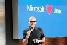 Nadella's tenure at Microsoft has emphasized working with companies and technologies with which Microsoft also competes, including Apple Inc.,[40] Salesforce,[41] IBM,[42] and Dropbox.[43] In contrast to previous Microsoft campaigns against the Linux operating system, Nadella proclaimed that "Microsoft ❤️ Linux",[44] and Microsoft joined the Linux Foundation as a Platinum member in 2016.[45]
