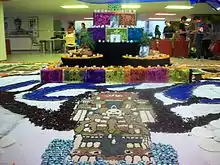 The tradition of making carpets with sawdust and other materials has since been extended to include Day of the Dead in Mexico, especially for large institutional altars called ofrendas and ofrendas to honor important people such as a one for writer Carlos Fuentes who died in 2012.[14][15] Day of the Dead carpets can accompany a traditional ofrenda on a table or can be the entire ofrenda.[15][16] These are most commonly made in the central part of Mexico. In Azcapotzalco in Mexico City, large carpets are made with sawdust along with marigold petals, corn, salt and candles for Day of the Dead. These include many made by primary school children.[17] Since 2007 carpets dedicated to Day of the Dead are made in Guanajuato,[18] for the festival "El Tapete de la Muerte".[19] However, the tradition has spread as far south as Teotitlán de Flores Magón, Oaxaca where they are made to honor the saints and Cancún as part of their Day of the Dead festivities.[14][20] They have been created as far north as Monterrey, where one large carpet/ofrenda surrounded by 300 candles was made to commemorate the victims of a massacre at the city's Casino Royale .[16]