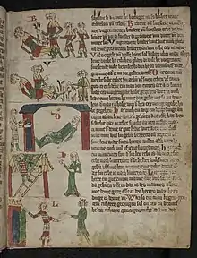 The Sachsenspiegel (German: [ˈzaksn̩ˌʃpiːɡl̩] ; Middle Low German: Sassen Speyghel; modern Low German: Sassenspegel; all literally "Saxon Mirror") is one of the most important law books and custumals compiled during the Holy Roman Empire. Originating between 1220 and 1235 as a record of existing local traditional customary laws and rulings, it was used in places until as late as 1900. Some legal principles as captured in the book reign into recent time laws throughout Europe. It is important not only for its lasting effect on later German and Dutch law but also as an early example of written prose in a German language.[1] The Sachsenspiegel is the first comprehensive law book not in Latin, but in Middle Low German. A Latin edition is known to have existed, but only fragmented chapters remain.