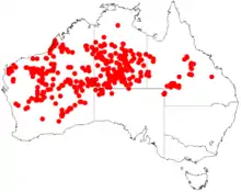 It is found in the arid regions of Western Australia, central Australia and Queensland, growing on red sand, clay or loamy soils, on sandplains & dunes.[4]