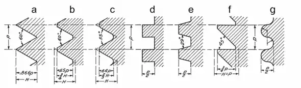 Standard types of screw threads: (a) V, (b) American National, (c) British Standard, (d) Square, (e) Acme, (f) Buttress, (g) Knuckle