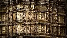 Intricately carved sculptures on the exterior of one of the temples of Khajuraho.[48]