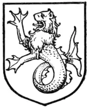 In heraldry, the term sea-lion (sometimes called a morse)[1] refers to a legendary creature that has the head and upper body of a lion, but with webbed forelimbs and a fish tail.[2] These occur most frequently as supporters, but also occur as crests and occasionally as charges.[1] Sea-lions are frequently found in "sejant" or "sejant-erect" (sitting upright) attitudes, but may also be found "naiant" (horizontally, as if swimming) or "assurgeant" (issuing from the waves of the sea).[1]