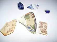 Sea pottery (also known as "sea china" or "sea porcelain" or "beach pottery") is pottery which is broken into worn pieces and shards and found on beaches along oceans or large lakes. Sea pottery has been tumbled and smoothed by the water and sand, creating small pieces of smooth, frosted pottery. It is often collected with more common sea glass by beachcombers.[1]