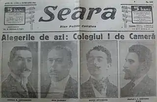 ![]() Title page of Seara, with pictures of candidates in the 1914 elections. Left to right: Grigore Gheorghe Cantacuzino; Nicolae Filipescu; Victor Antonescu; Vintilă Brătianu | |