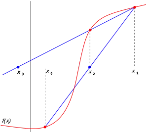 As can be seen from this formula, two initial values x0 and x1 are required. Ideally, they should be chosen close to the desired zero.