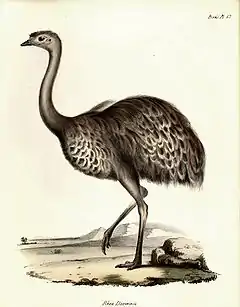 Back at Montevideo, Darwin was introduced to Conrad Martens, the replacement artist brought on board Beagle after Augustus Earle had to leave due to health problems. They sailed south, putting in at Port Desire on 23 December, and the following day Darwin shot a guanaco which provided them with a Christmas meal. Early in the new year, Martens shot a rhea which they enjoyed eating before Darwin realised that this was the elusive smaller rhea and preserved the remains.[130] On 9 January 1834, 110 miles (180 km) further south, they reached Port St Julian and exploring the local geology in cliffs near the harbour Darwin found fossils of pieces of spine and a hind leg of "some large animal, I fancy a Mastodon".[143][139] On 26 January, they entered the Straits of Magellan, and at St. Gregory's Bay, they met half-civilised Patagonian "giants" over 6 ft (1.8 m) tall,[144] described by Darwin as "excellent practical naturalists". One told him that the smaller rheas were the only species this far south, while the larger rheas kept to the north, the species meeting around the Rio Negro.[145]