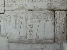 The sekhem scepter is a type of ritual scepter in ancient Egypt. As a symbol of authority, it is often incorporated in names and words associated with power and control. The sekhem scepter (symbolizing "the powerful") is related to the kherp (ḫrp) scepter (symbolizing "the controller") and the aba scepter (symbolizing "the commander"), which are all represented with the same hieroglyphic symbol.[1] These scepters resembled a flat paddle on a papyrus umbel handle. Its symbolic role may have originated in Abydos as a fetish of Osiris. The shape of the scepter might have derived from professional tools.