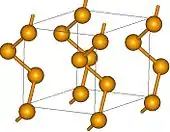 The most stable and dense form of selenium is gray and has a chiral hexagonal crystal lattice (space group 152 or 154 depending on the chirality)[14] consisting of helical polymeric chains, where the Se–Se distance is 237.3 pm and Se–Se–Se angle is 103.1°. The minimum distance between chains is 343.6 pm. Gray selenium is formed by mild heating of other allotropes, by slow cooling of molten selenium, or by condensing selenium vapor just below the melting point. Whereas other selenium forms are insulators, gray selenium is a semiconductor showing appreciable photoconductivity. Unlike the other allotropes, it is insoluble in CS2.[7] It resists oxidation by air and is not attacked by nonoxidizing acids. With strong reducing agents, it forms polyselenides. Selenium does not exhibit the changes in viscosity that sulfur undergoes when gradually heated.[10][15]