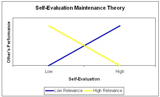 This graph illustrates the basic principles of Tesser's (1988) self-evaluatory maintenance model of behavior. Relevance determines whether reflection or comparison will occur. When relevance is low (the factor does not affect self-definition) as the other's performance increases, so does self-evaluation, allowing that person to share in the celebration of the other person (reflection). When relevance is high (the factor is important to self-definition also) as the other's performance increases, self-evaluation decreases because that person is being compared to the other person (comparison). If relevance is high, then one will engage in comparison, but if relevance is low, one will engage in reflection.[1]