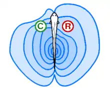 Fish and some aquatic amphibians detect hydrodynamic stimuli via a lateral line. This system consists of an array of sensors called neuromasts along the length of the fish's body.[11] Neuromasts can be free-standing (superficial neuromasts) or within fluid-filled canals (canal neuromasts). The sensory cells within neuromasts are polarized hair cells contained within a gelatinous cupula.[12] The cupula, and the stereocilia which are the "hairs" of hair cells, are moved by a certain amount depending on the movement of the surrounding water. Afferent nerve fibers are excited or inhibited depending on whether the hair cells they arise from are deflected in the preferred or opposite direction. Lateral line neurons form somatotopic maps within the brain informing the fish of amplitude and direction of flow at different points along the body. These maps are located in the medial octavolateral nucleus (MON) of the medulla and in higher areas such as the torus semicircularis.[13]