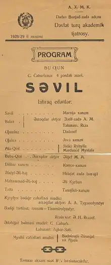 Sevil is a play by Azerbaijani playwright Jafar Jabbarly written in 1928. It focused on the theme of the role of women, their oppression, struggle, and ultimately, victory over dated patriarchal traditions.[1][2][3] Many women discarded their veils in the city theater after seeing the play.[4]