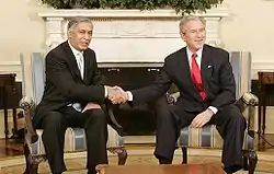 Relations with Israel were considered important by Aziz's government, and supported Musharraf's policy on Israel.[78] At foreign fronts, Aziz maintained a "Telephone Policy"[79] on diplomatic engagement with Israel, whilst keeping Saudi Arabia and Turkey in tacit contact.[79][80] During his tenure, bilateral relations with the United Kingdom were enhanced and reached to a new level after meeting with British prime minister Tony Blair in 2005, and tightened the economic and defence relations with British counterpart Gordon Brown in 2007.[81] Brown thanked Aziz for the successful launching of a $500 million Eurobond, which was oversubscribed four times.[82] After assuming the office of prime minister, Aziz left for China, as his foreign state visit as prime minister in 2004.[83] In 2007, Aziz made his final state visit as prime minister to China to sign a Free Trade Agreement[84] with China, and regarded the country as a "strategic partner"[85] and a "time-tested friend,"[85] whilst China regarded the FTA agreement as "a historic development".[85] Aziz built closer economic ties with India while alleviating the territorial conflicts. After meeting with Indian counterpart Manmohan Singh, a confident measuring building process was initiated by Aziz.[86]