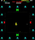 16 bandits (also referred to as 'gangs')[11] surround the outer rim, marked by a dotted "fence". Bullets from either Mr. Jack or the bandits can destroy the fenceposts, and they can function as defensive walls or aiming obstacles for the player. Larger barriers also exist on the midpoint of each side of the screen, and bullets from either Mr. Jack or the bandits will slowly erode these. The top and bottom barriers display the current level number.