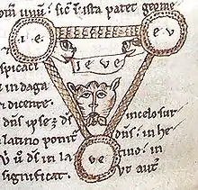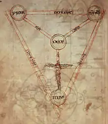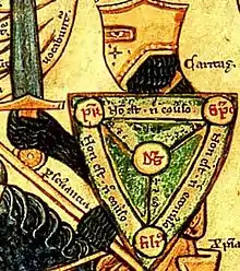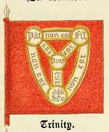 The precise origin of this diagram is unknown, but it was evidently influenced by 12th-century experiments in symbolizing the Trinity in abstract visual form—mainly by Petrus Alfonsi's Tetragrammaton-Trinity diagram of c. 1109 (and possibly also by Joachim of Fiore's different Tetragrammaton-Trinity diagram of three circles, which in turn led to the Borromean rings being used as a symbol of the Trinity [2]), in combination with the Athanasian Creed. The Shield of the Trinity diagram is attested from as early as a c. 1208–1216 manuscript of Peter of Poitiers' Compendium Historiae in Genealogia Christi, but the period of its most widespread use was during the 15th and 16th centuries, when it is in found in a number of English and French manuscripts and books (such as the Sherborne Missal[3]), and as part of stained-glass windows and ornamental carvings in a number of churches (many in East Anglia). The diagram was used heraldically from the mid-13th century, when a shield-shaped version of the diagram (not actually placed on a shield) was included among the c. 1250 heraldic shields in Matthew Paris' Chronica Majora, while the c. 1260 allegorical illustrations of a knight battling the seven deadly sins in a manuscript of William Peraldus' Summa Vitiorum, and of a woman penitent fending off diabolical attacks in the De Quincy Apocalypse, show the diagram placed on a shield. In the 15th century, one form of the Shield of the Trinity was considered to be the coat of arms of God (see discussion below). The use of the diagram declined in England with the rise of Protestantism, and from the 17th century to the early 19th century, it was mainly of interest to historians of heraldry; but beginning in the 19th century it underwent a limited revival as an actively used Christian symbol among English-speaking Christians, partly due to being included in books such as the Handbook of Christian Symbolism by William James Audsley and George Ashdown Audsley (1865).