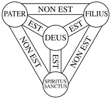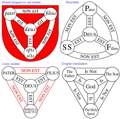 The Shield of the Trinity or Scutum Fidei (Latin for "shield of faith") is a traditional Christian visual symbol which expresses many aspects of the doctrine of the Trinity, summarizing the first part of the Athanasian Creed in a compact diagram. In late medieval Europe, this emblem was considered to be the heraldic arms of God (and of the Trinity).
