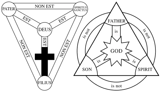 This diagram consists of four nodes (generally circular in shape) interconnected by six links. The three nodes at the edge of the diagram are labelled with the names of the three persons of the Trinity (traditionally the Latin-language names, or scribal abbreviations thereof): The Father ("PATER"), The Son ("FILIUS"), and The Holy Spirit ("SPIRITUS SANCTUS"). The node in the center of the diagram (within the triangle formed by the other three nodes) is labelled God (Latin "DEUS"), while the three links connecting the center node with the outer nodes are labelled "is" (Latin "EST"), and the three links connecting the outer nodes to each other are labelled "is not" (Latin "NON EST").
