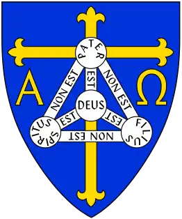 Gules, an orle and pall Argent, conjoined and surmounted of four plates, occupying the dexter and sinister chief and the base and fess points respectively; the first inscribed "Pater", the second "Filius", and the third "Spiritus Sanctus", the centre "Deus"; the connecting portions of the orle between them having the words "non est", and those of the pall "est".