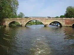 A few months later on 18 June 1827 the Reading Mercury noted that "the Substantial Stone Bridge over the River Thames at Shillingford has for a long time been sufficiently complete for the passage of travellers and their carriages and it will very shortly be finished in all its ornamental parts".[13] The new bridge was entirely made of stone with three semi-circular river spans, the middle one 52 feet (16 m) wide and the flanking pair 36 feet (11 m) each. On the Oxfordshire (north) bank was a small tow-path arch and a 300 feet (91 m) causeway. The toll-keeper's cottage was located on the downstream side of the Oxfordshire bank.[11]