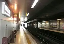 The station has two opposing side platforms at ground level on either side of the two tracks, which are side by side.[2] The station building is built above the tracks. Although it is considered to be an above-ground station, most of the station is actually within a tunnel so it is somewhat like an underground station.