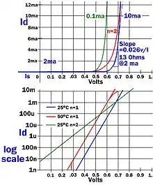 - ↑ William Shockley (Jul 1949). "The Theory of p-n Junctions in Semiconductors and p-n Junction Transistors". The Bell System Technical Journal. 28 (3): 435–489. doi:10.1002/j.1538-7305.1949.tb03645.x.. Equation 3.13 on page 454.