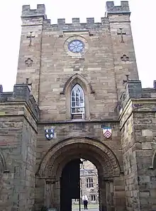 Durham Castle. Left: arms of the See of Durham; right: Argent three chevronels gules a label of three points azure, arms of Shute Barrington, Bishop of Durham
