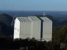 The 2.3 metre telescope at Siding Spring Observatory is operated by the Australian National University. The Advanced Technology Telescope was constructed during the early 1980s and featured, at the time, bold features and design: an unusually thin mirror, an alt-az mount and co-rotating dome.[1][2] The optical telescope has Altazimuth mount and a primary mirror with a focal length of f/2.05.[2] It is housed in a box-shaped building which rotates as the telescope tracks objects.