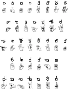 Sutton orders signs in ten groups based on which fingers are extended on the dominant hand. These are equivalent to the numerals one through ten in ASL. Each group is then subdivided according to the actual hand shape, and then subdivided again according to the plane the hand is in (vertical, then horizontal), then again according to the basic orientation of the hand (palm, side, back). An ordering system has been proposed using this beginning and examples from both American Sign Language and Brazilian Sign Language (LIBRAS).[12] The current system of ordering for SignWriting is called the Sign Symbol Sequence which is parsed by the creator of each sign as recorded into the on-line dictionary. This system allows for internal ordering by features including handshape, orientation, speed, location, and other clustered features not found in spoken dictionaries.