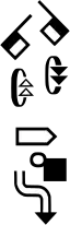 As with orientation, movement arrows distinguish two planes: Movement in the vertical plane (up & down) is represented by arrows with double stems, as at the bottom of the diagram at left, while single-stemmed arrows represent movement parallel to the floor (to & fro). In addition, movement in a diagonal plane uses modified double-stemmed arrows: A cross bar on the stem indicates that the motion is away as well up or down, and a solid dot indicates approaching motion. To & fro movement that also goes over or under something uses modified single-stemmed arrows, with the part of the arrow representing near motion thicker than the rest. These are iconic, but conventionalized, and so need to be learned individually.