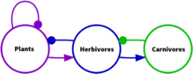 A three-variable signed digraph representing a simple trophic system