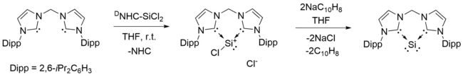 - 1 2 3 4 Takagi, Nozomi; Shimizu, Takayasu; Frenking, Gernot (2009-03-23). "Divalent Silicon(0) Compounds". Chemistry - A European Journal. 15 (14): 3448–3456. doi:10.1002/chem.200802739. ISSN 0947-6539. PMID 19229927.