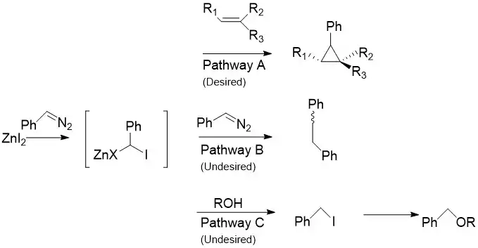 The Charette modification replaces the CH2I2 normally found in the Simmons–Smith reaction with aryldiazo compounds, such as phenyldiazomethane, in Pathway A.[30] Upon treatment with stoichiometric amounts of zinc halide, an organozinc compound similar to the carbenoid discussed above is produced. This can react with almost all alkenes and alkynes, including styrenes and alcohols. This is especially useful, as the unmodified Simmons-Smith is known to deprotonate alcohols. Unfortunately, as in Pathway B shown the intermediate can also react with the starting diazo compound, giving cis- or trans- 1,2-diphenylethene. Additionally, the intermediate can react with alcohols to produce iodophenylmethane, which can further undergo an SN2 reaction to produce ROCHPh, as in Pathway C.