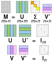 Specifically, the singular value decomposition of an complex matrix M is a factorization of the form where U is an complex unitary matrix, is an rectangular diagonal matrix with non-negative real numbers on the diagonal, V is an complex unitary matrix, and is the conjugate transpose of V. Such decomposition always exists for any complex matrix. If M is real, then U and V can be guaranteed to be real orthogonal matrices; in such contexts, the SVD is often denoted .