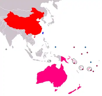 The PRC (red), the ROC (blue), and the fourteen sovereign countries of Oceania. Those in pink recognise the PRC; those in light blue recognise the ROC. (as of January 2024)