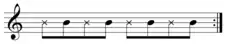 4 time (𝄆1 & 2 & 3 & 4 & 𝄇), the chosen guitar chord is played on the downbeat (indicated by numbers), and then a ghost note is played on the upbeat (indicated by ampersands) by lifting the left hand off the fret a few millimeters.[5] However, most traditional ska is focused on the upbeat; playing on the downbeat is more closely associated with reggae, where the ska strokes are played much more slowly as opposed to ska.